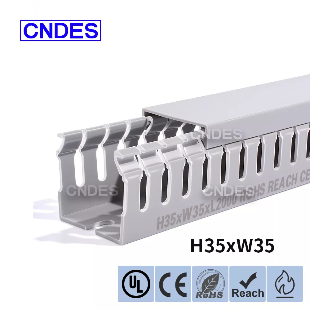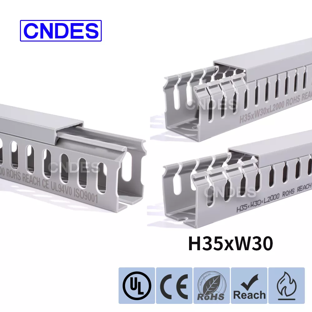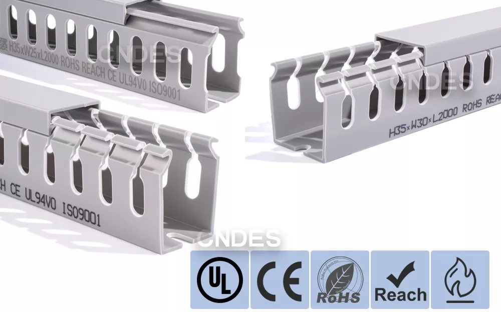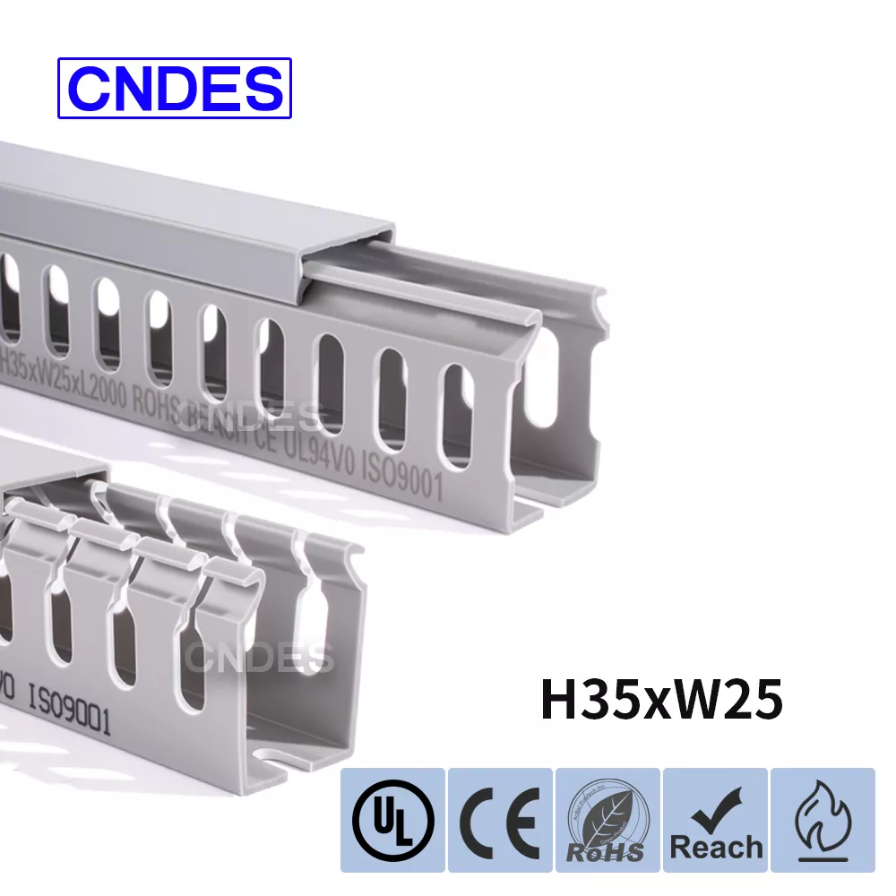 சீன நிறுவனமான CNDES ஆல் தயாரிக்கப்பட்ட தனிப்பயனாக்கப்பட்ட 35mm உயரம் துளையிடப்பட்ட PVC வயர் ரூட்டிங் டக்ட், ஒரு திடமான PVC தளம் மற்றும் நீக்கக்கூடிய கவர் ஆகியவற்றைக் கொண்டுள்ளது. இரண்டு பக்கங்களிலும் முத்திரையிடப்பட்ட, "சீப்புப் பற்களை" உருவாக்கும் சம தூர விரல் போன்ற பள்ளங்களைக் கொண்டுள்ளது. இந்த பற்கள் கையால் உடைக்கப்படலாம், கம்பி எந்த நிலையிலிருந்தும் கிடைமட்டமாக வெளியேற அனுமதிக்கிறது. கவர் எளிதாக மீண்டும் இடத்திற்குத் திரும்புகிறது, நேர்த்தியான தோற்றத்தை பராமரிக்கிறது. கீழே உள்ள மவுண்டிங் துளைகளின் வரிசை DIN 43659 நிலையான இடைவெளிக்கு இணங்குகிறது. M5 திருகுகள் அல்லது ரிவெட்டுகளைப் பயன்படுத்தி பேனல்கள், கேபினெட் பிரேம்கள் அல்லது ஒத்த கட்டமைப்புகளுக்கு இது விரைவாகப் பாதுகாக்கப்படலாம்.