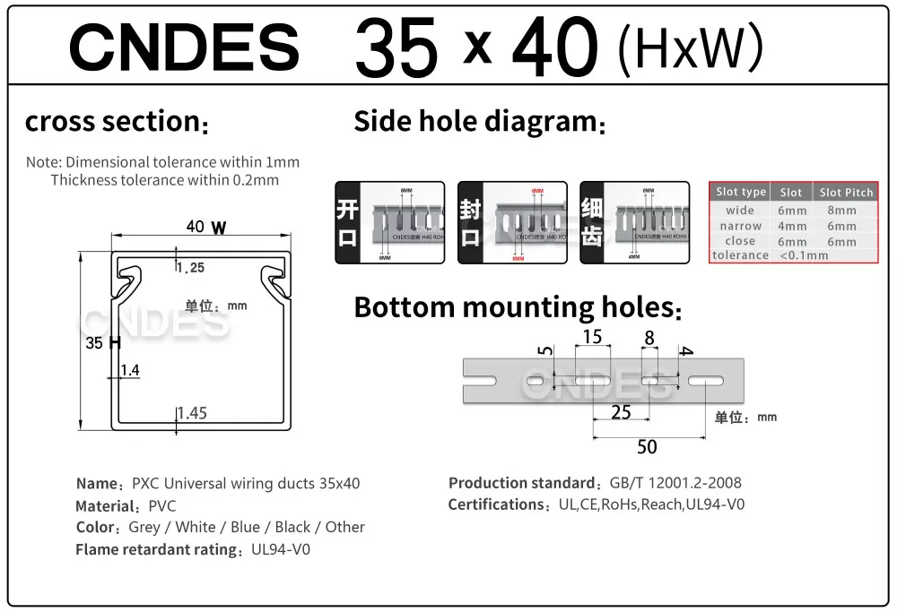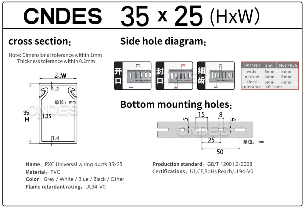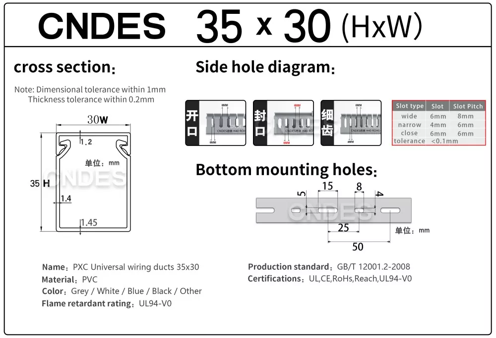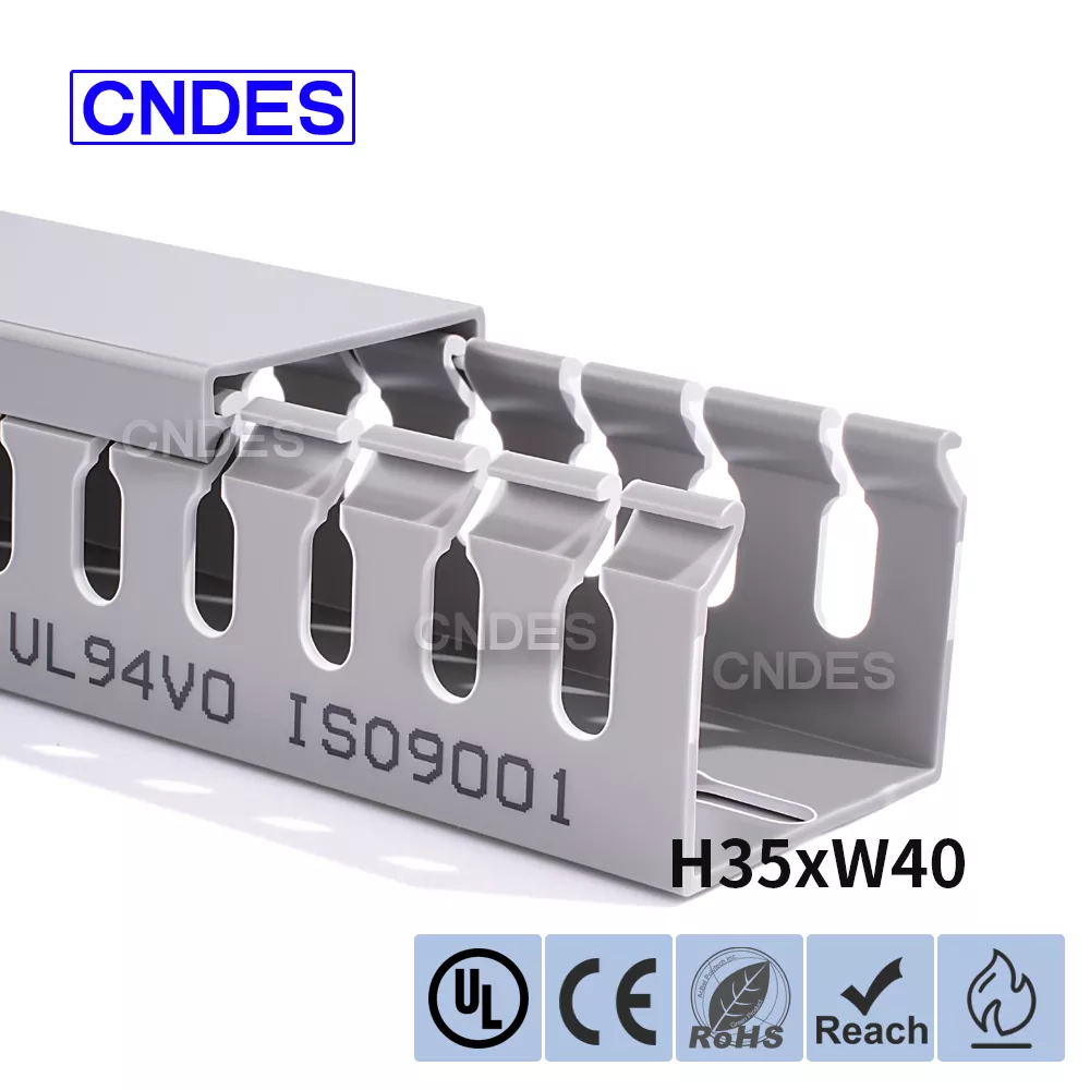 சீன நிறுவனமான CNDES ஆல் தயாரிக்கப்பட்ட தனிப்பயனாக்கப்பட்ட 35mm உயரம் துளையிடப்பட்ட PVC வயர் ரூட்டிங் டக்ட், ஒரு திடமான PVC தளம் மற்றும் நீக்கக்கூடிய கவர் ஆகியவற்றைக் கொண்டுள்ளது. இரண்டு பக்கங்களிலும் முத்திரையிடப்பட்ட, "சீப்புப் பற்களை" உருவாக்கும் சம தூர விரல் போன்ற பள்ளங்களைக் கொண்டுள்ளது. இந்த பற்கள் கையால் உடைக்கப்படலாம், கம்பி எந்த நிலையிலிருந்தும் கிடைமட்டமாக வெளியேற அனுமதிக்கிறது. கவர் எளிதாக மீண்டும் இடத்திற்குத் திரும்புகிறது, நேர்த்தியான தோற்றத்தை பராமரிக்கிறது. கீழே உள்ள மவுண்டிங் துளைகளின் வரிசை DIN 43659 நிலையான இடைவெளிக்கு இணங்குகிறது. M5 திருகுகள் அல்லது ரிவெட்டுகளைப் பயன்படுத்தி பேனல்கள், கேபினெட் பிரேம்கள் அல்லது ஒத்த கட்டமைப்புகளுக்கு இது விரைவாகப் பாதுகாக்கப்படலாம்.