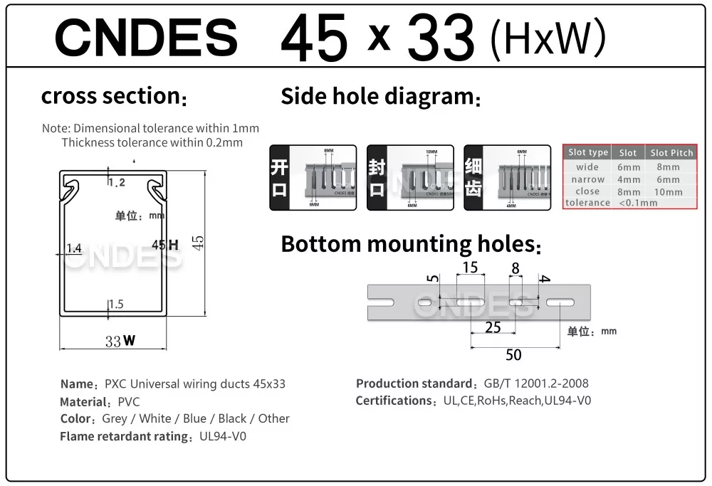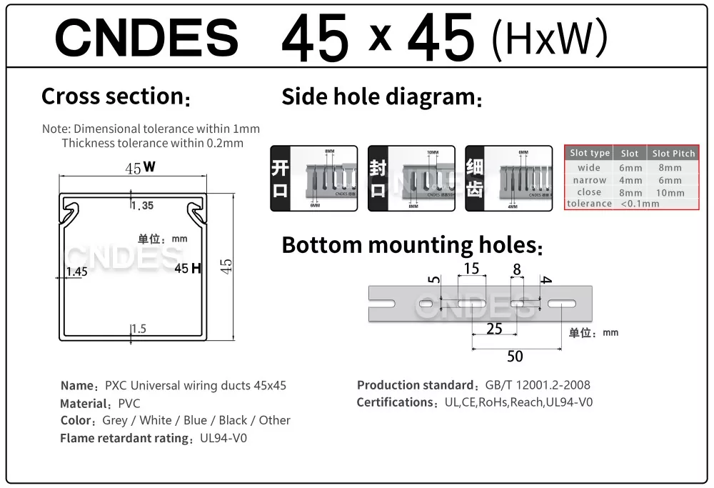 தொழில்முறை உற்பத்தியாளராக, நாங்கள் உங்களுக்கு 45mm-உயரம் CNDES ஸ்லாட்டட் PVC வயர் கவர் டக்டை வழங்க விரும்புகிறோம். 45*25, 45*33, 45*45 உட்பட.
