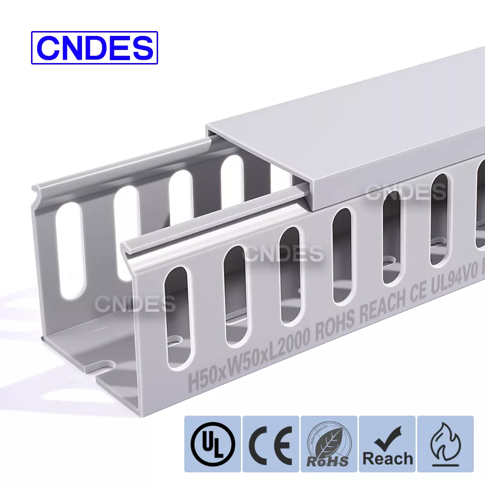 செங்குத்து பரப்புகளில் நிறுவும் போது, நழுவுவதைத் தடுக்க, எதிர்ப்பு சீட்டு வடிவமைப்புகளுடன் (எ.கா., ரப்பர் பட்டைகள் அல்லது ஸ்னாப்-வலுவூட்டப்பட்ட வகைகள்) அட்டைகளைத் தேர்ந்தெடுக்கவும். செங்குத்தாக நிறுவப்பட்ட துளையிடப்பட்ட PVC ஃபிங்கர் வகை வயரிங் டக்டை அவ்வப்போது ஆய்வு செய்து, கவர்கள் புவியீர்ப்புத் தளர்வுக்கு எதிராக பாதுகாப்பாக இருப்பதை உறுதிசெய்யவும். வரையறுக்கப்பட்ட இடைவெளிகளில், பொருத்தமான நீளத்திற்கு வழித்தடங்களை வெட்டுங்கள் (சுத்தமான, ஃப்ளஷ் விளிம்புகளைப் பராமரிக்க சிறப்பு வெட்டுக் கருவிகளைப் பயன்படுத்தவும்). வெட்டப்பட்ட பிறகு, வெட்டப்பட்ட விளிம்பை கூர்மையாக சரிபார்க்கவும். கேபிள் அல்லது ஆபரேட்டர் காயத்தைத் தடுக்க தேவைப்பட்டால் சிராய்ப்பு காகிதத்துடன் மணல் அள்ளுங்கள். சுற்றுப்புற வெப்பநிலைகள் குழாயின் மேல் வெப்பநிலை வரம்பை (எ.கா., 50°C அல்லது 85°C) நெருங்கினால், உயர்-வெப்பநிலை-எதிர்ப்பு மாதிரியைத் தேர்ந்தெடுக்கவும் அல்லது கூடுதல் வெப்பச் சிதறல் நடவடிக்கைகளைச் செயல்படுத்தவும். எடுத்துக்காட்டாக, வழித்தடத்தைச் சுற்றி காற்றோட்டம் இடத்தை ஒதுக்கவும் அல்லது குளிரூட்டும் விசிறிகளை நிறுவவும்.